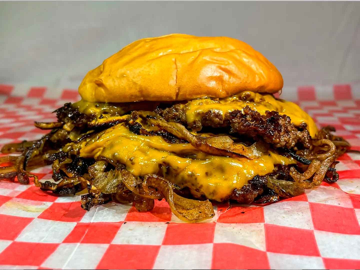 Carne Smash 120gr x2, Cebolla y Cheddar x5. Una hamburguesa legendaria. Incluye papas.